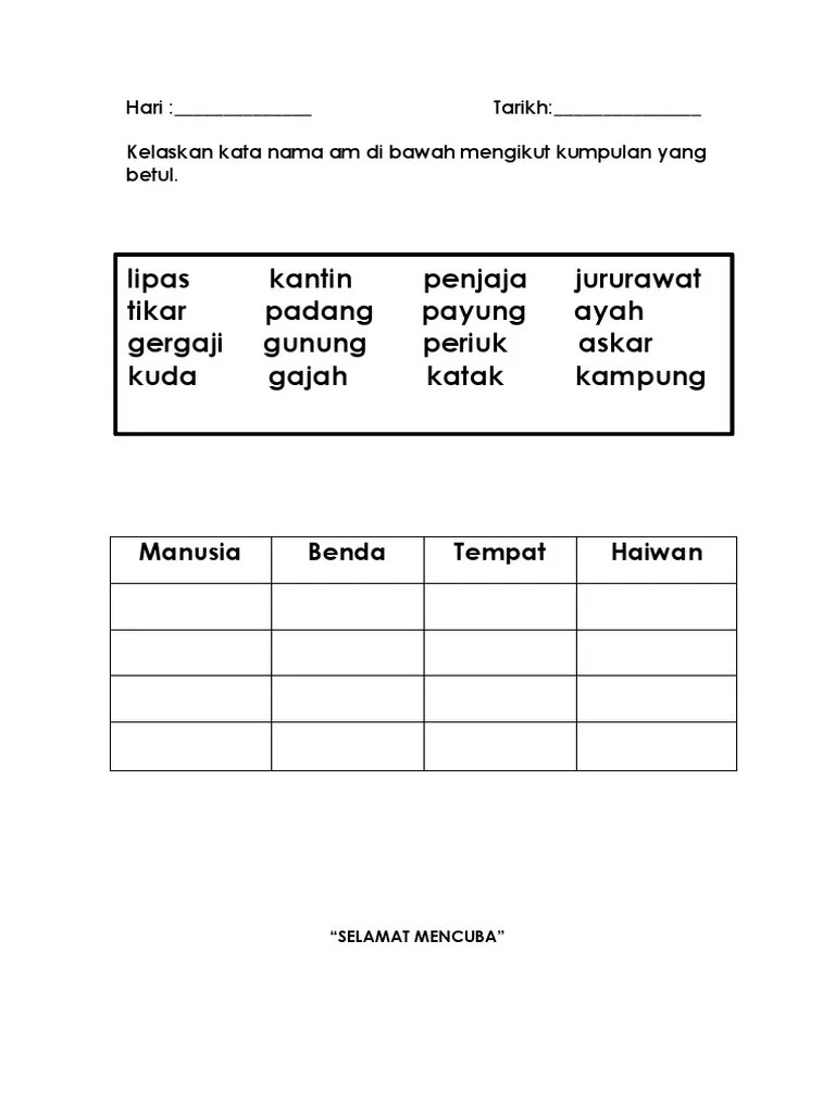 Yang dibina selaras dengan keperluan silibus pelajar tahun 1 hingga tingkatan 5. You can do the exercises online or download the worksheet as pdf. Video ini akan membincangkan tentang kata nama am bagi tahun 1.untuk mendapatkan modul ini dan modul latihan yang , sila ke blog saya . Bahasa malaysia tahun 1 latihan kata nama am 4 time worksheets kindergarten math worksheets activities for 6 year olds.